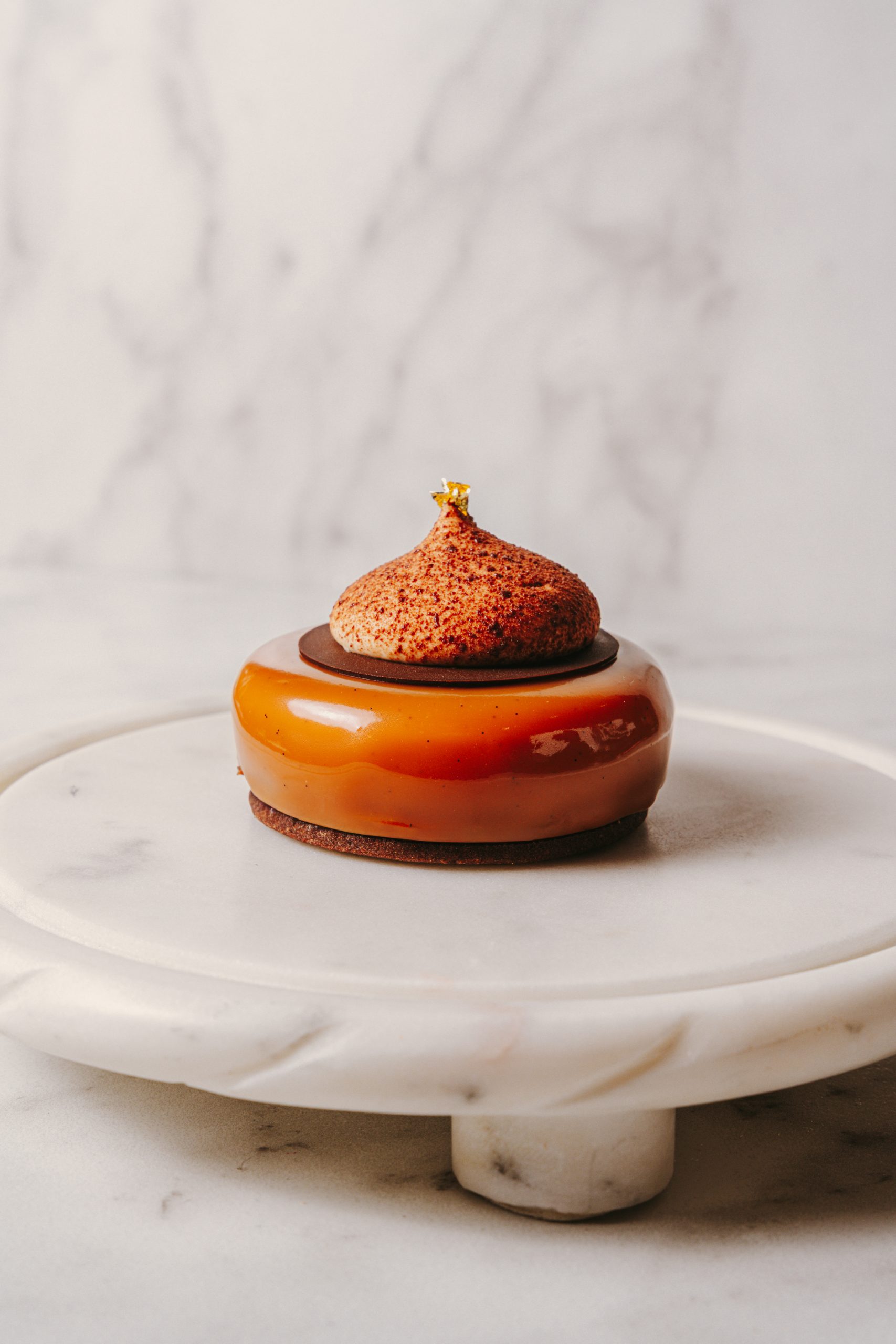 Salted caramel mousse, vanilla cream and a caramel chantilly cream on a base of a cocoa biscuit. (contains almonds)
